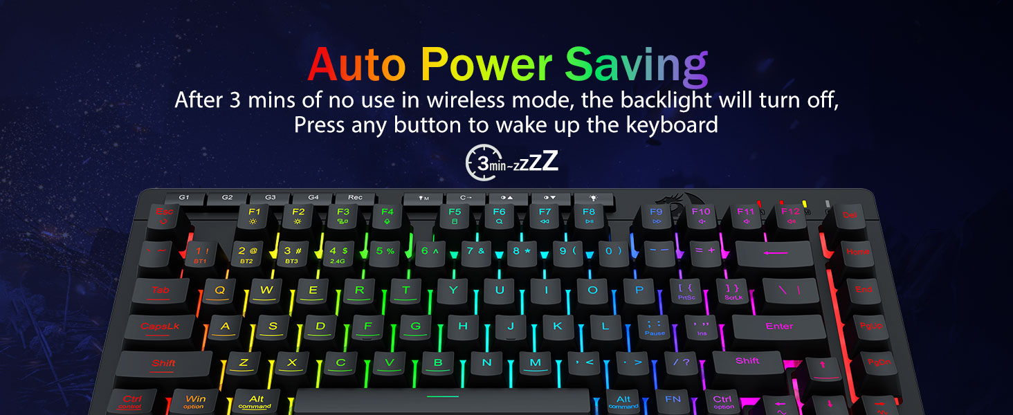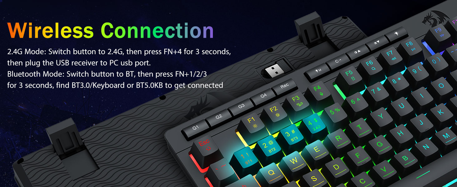 สลับอุปกรณ์ได้อย่างง่ายดายด้วยปุ่มลัดหรือปุ่มด้านข้าง เหมาะสำหรับการตั้งค่าการทำงาน/การเล่นเกมแบบผสมผสาน ใช้งานได้นานหลายสัปดาห์ด้วยแบตเตอรี่ 4,000mAh (สแตนด์บาย 30+ วัน, รันไทม์ RGB 50 ชม.)