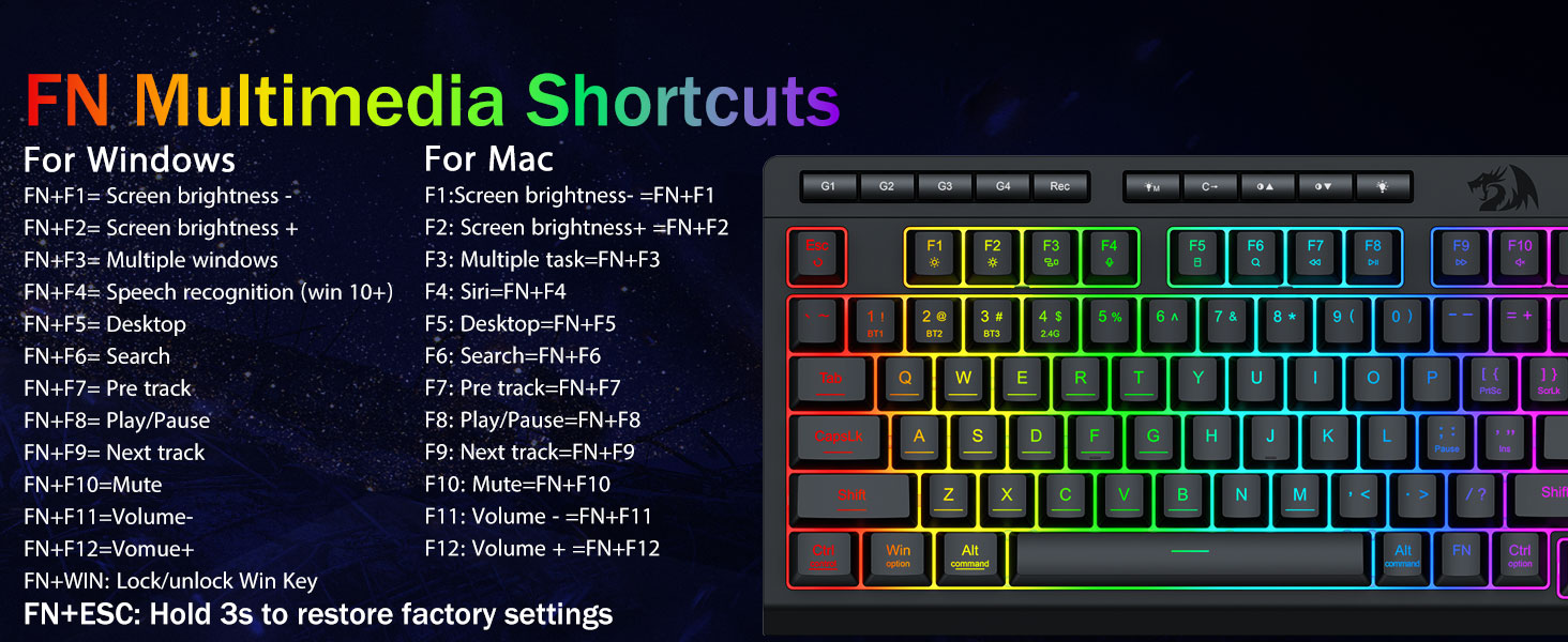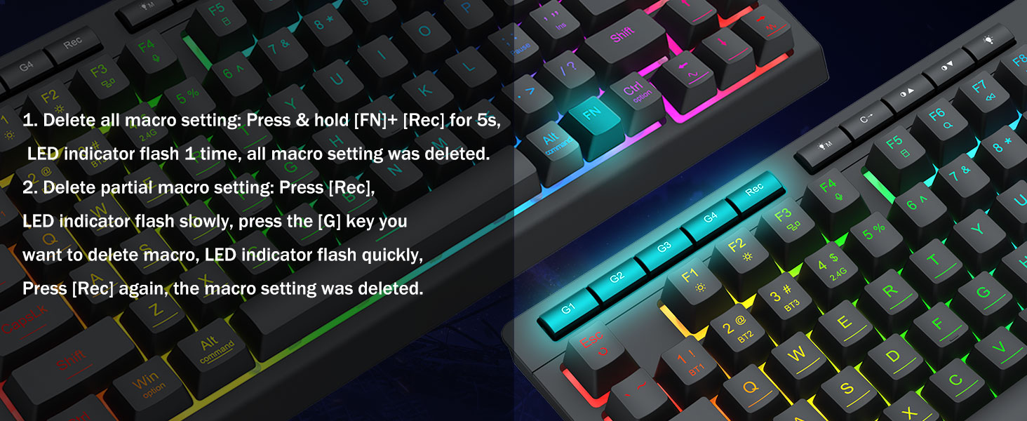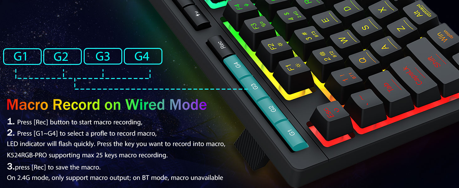 มาโครที่ปรับแต่งได้ การควบคุมที่ง่ายดาย- ตั้งโปรแกรมปุ่มมาโครออนบอร์ด 4 ปุ่ม (G1-G4) ได้ทันที โดยไม่ต้องใช้ซอฟต์แวร์ บันทึกคอมโบที่ซับซ้อนสำหรับการเล่นเกม ทางลัดเพื่อประสิทธิภาพการทำงาน หรือคำสั่งสื่อ กำหนดขั้นตอนการทำงานของคุณในไม่กี่วินาที คุณยังสามารถใช้ซอฟต์แวร์เพื่อปรับแต่งฟังก์ชัน สร้างมาโคร ปรับไฟ RGB และตั้งค่าทางลัดได้