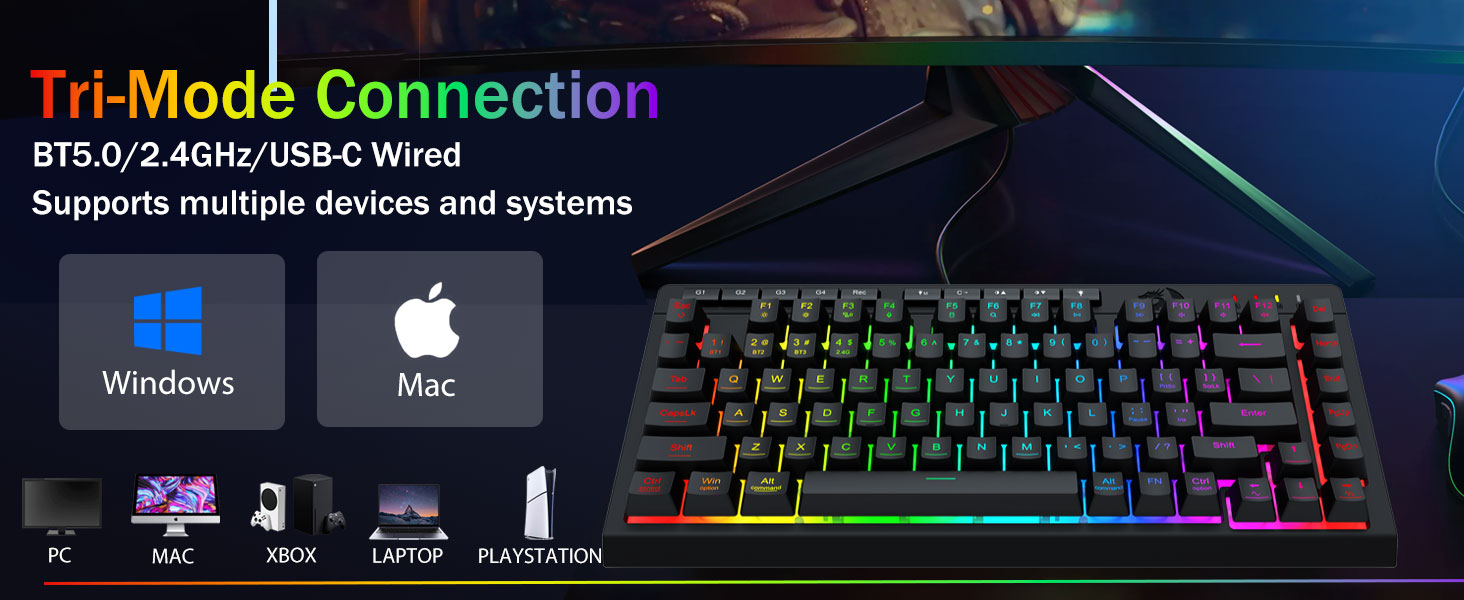 ความเก่งกาจของ Tri-Mode และการเรียนรู้อุปกรณ์ที่หลากหลาย- สลับระหว่างโหมดไร้สาย Bluetooth 5.0, 2.4GHz หรือแบบมีสาย USB-C ได้อย่างราบรื่น โดยเชื่อมต่ออุปกรณ์ได้สูงสุด 5 เครื่องพร้อมกัน (PC, Mac, แท็บเล็ต, โทรศัพท์, PS/XBOX)