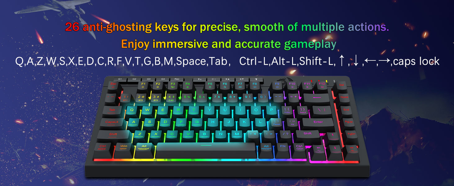 ประสิทธิภาพการเล่นเกมระดับมืออาชีพและการควบคุมแบ็คไลท์โดยเฉพาะ- มีปุ่มป้องกันการโกสต์ (ปุ่มที่มีขีดล่าง) ซึ่งช่วยให้ 26 ปุ่มทำงานพร้อมกันเพื่อการตอบสนองเกมที่รวดเร็วและแม่นยำตามที่คุณต้องการ ปุ่มเข้าถึงด่วนสำหรับความสว่าง โหมดแสงสว่าง และโหมดเกม เพื่อปรับความสว่าง โปรไฟล์แสงอย่างรวดเร็ว และเปิดใช้งานโหมดเกมด้วยการกดปุ่มเพียงปุ่มเดียว