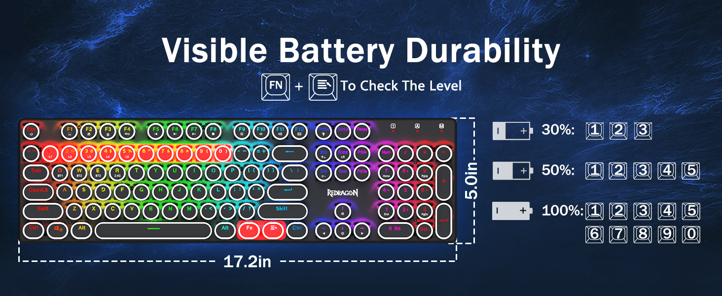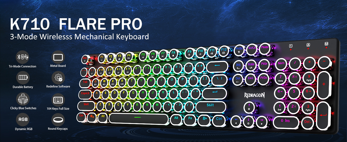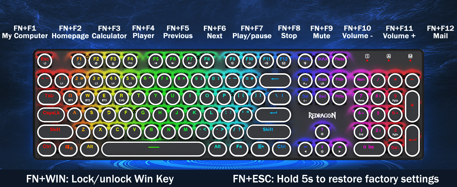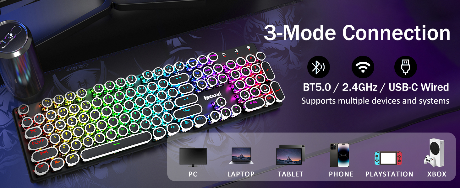 บัญชีผู้ใช้นี้เป็นส่วนตัวมาพร้อมเทคโนโลยีการเชื่อมต่อสามโหมดที่เป็นนวัตกรรมใหม่ของ Redragon โหมดไร้สายแบบมีสาย USB-C, Bluetooth 5.0/3.0 และ 2.4Ghz ซึ่งจะทำให้ประสบการณ์ผู้ใช้ได้รับการอัพเกรดไปอีกระดับในทุกสาขา กด FN + Q/W/E ไปที่โหมด Bluetooth กด FN + R ถึงโหมด 2.4G