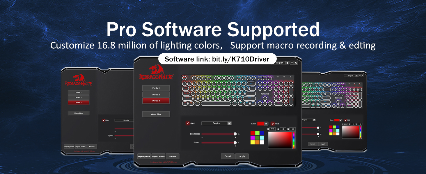 บัญชีผู้ใช้นี้เป็นส่วนตัวโหมดแบ็คไลท์ที่ตั้งไว้ล่วงหน้าสูงสุด 20 โหมดสามารถเลือกได้ฟรีโดยใช้คีย์บอร์ดหรือซอฟต์แวร์ 4 ระดับความสว่างและความเร็วในการไหลสามารถปรับได้บนเรือ เลือกโหมดที่คุณต้องการสำหรับการเล่น มีสีทึบให้เลือก 7 สี: แดง เขียว น้ำเงิน เหลือง ม่วง ฟ้า ขาว แต่ละคีย์สามารถปรับแต่งให้เป็นสีต่างๆ ที่คุณต้องการได้