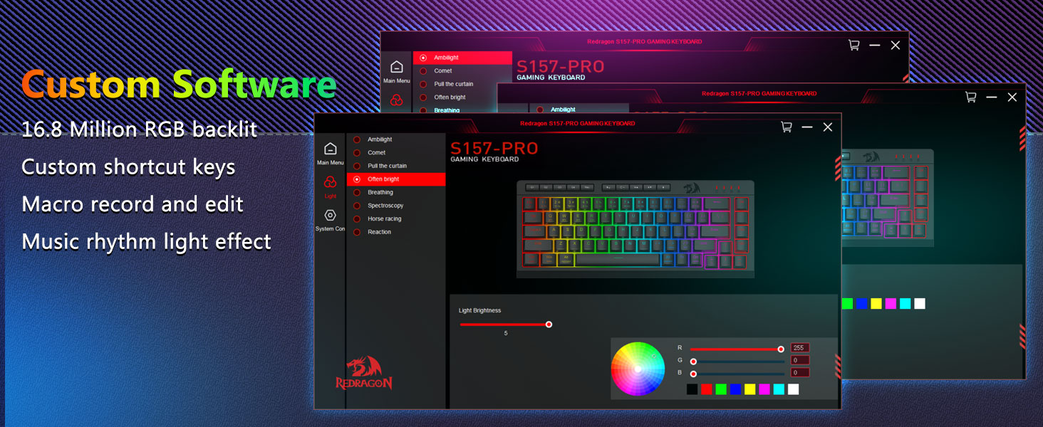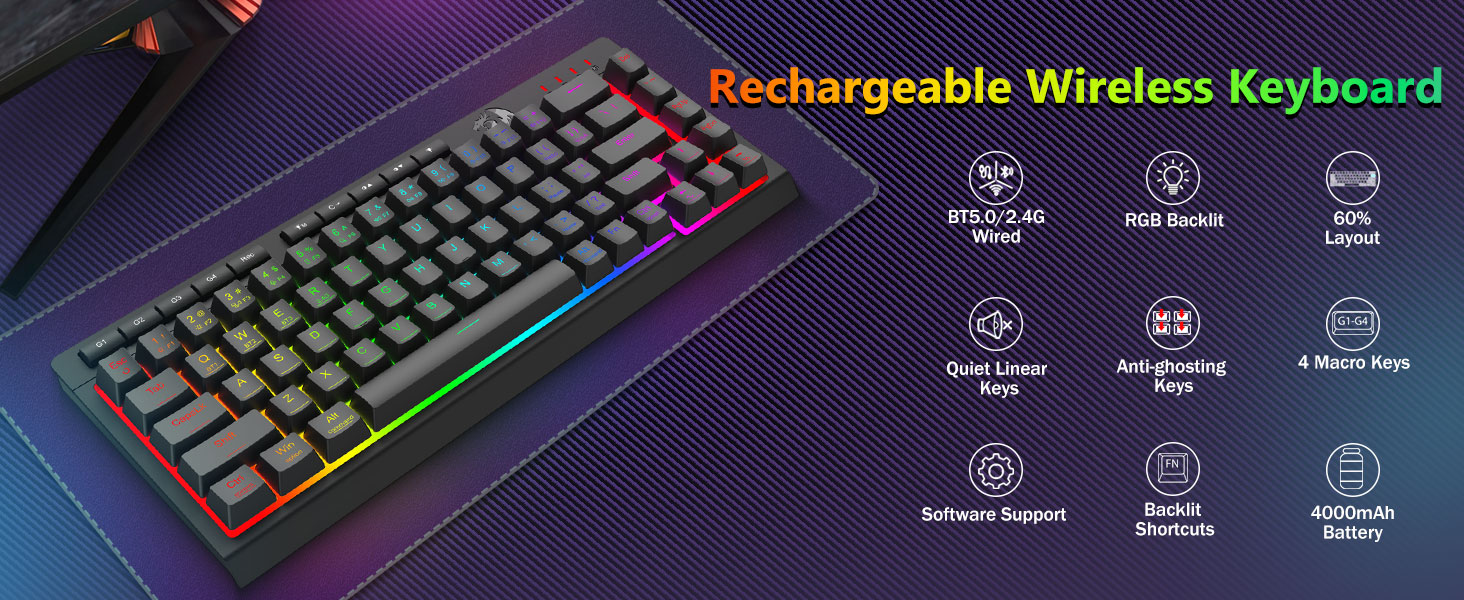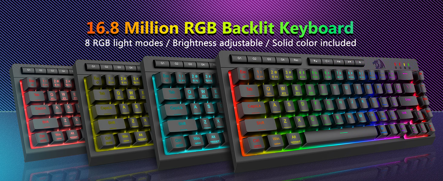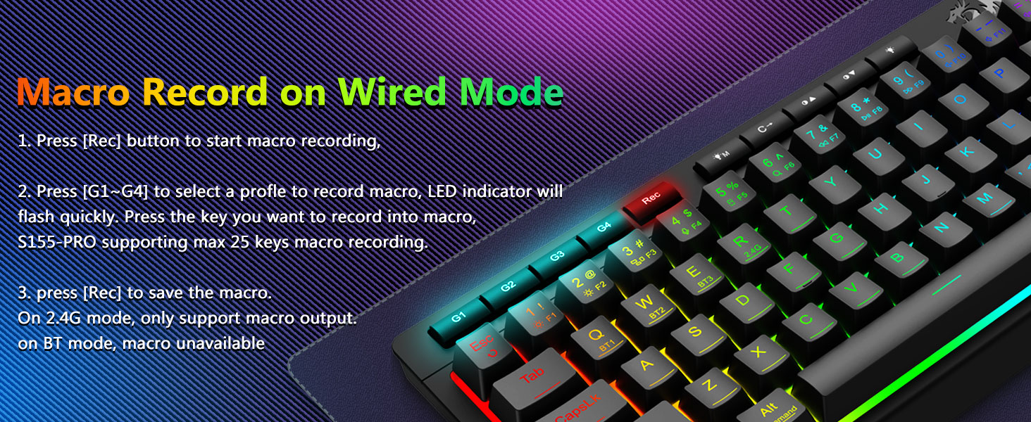 มาโครที่ปรับแต่งได้, การควบคุมแบ็คไลท์โดยเฉพาะ- ตั้งโปรแกรมปุ่มมาโครออนบอร์ด 4 ปุ่ม (G1-G4) ได้ทันที โดยไม่ต้องใช้ซอฟต์แวร์ บันทึกคอมโบที่ซับซ้อนสำหรับการเล่นเกม ทางลัดเพื่อประสิทธิภาพการทำงาน หรือคำสั่งสื่อ กำหนดขั้นตอนการทำงานของคุณในไม่กี่วินาที คุณยังสามารถใช้ซอฟต์แวร์เพื่อปรับแต่งฟังก์ชัน สร้างมาโคร ปรับไฟ RGB และตั้งค่าทางลัดได้ มีปุ่มป้องกันการโกสต์ (ปุ่มที่มีขีดล่าง) ซึ่งช่วยให้ 26 ปุ่มทำงานพร้อมกันเพื่อการตอบสนองเกมที่รวดเร็วและแม่นยำตามที่คุณต้องการ ปุ่มเข้าถึงด่วนสำหรับความสว่าง โหมดแสงสว่าง และโหมดเกม เพื่อปรับความสว่าง โปรไฟล์แสงอย่างรวดเร็ว และเปิดใช้งานโหมดเกมด้วยการกดปุ่มเพียงปุ่มเดียว