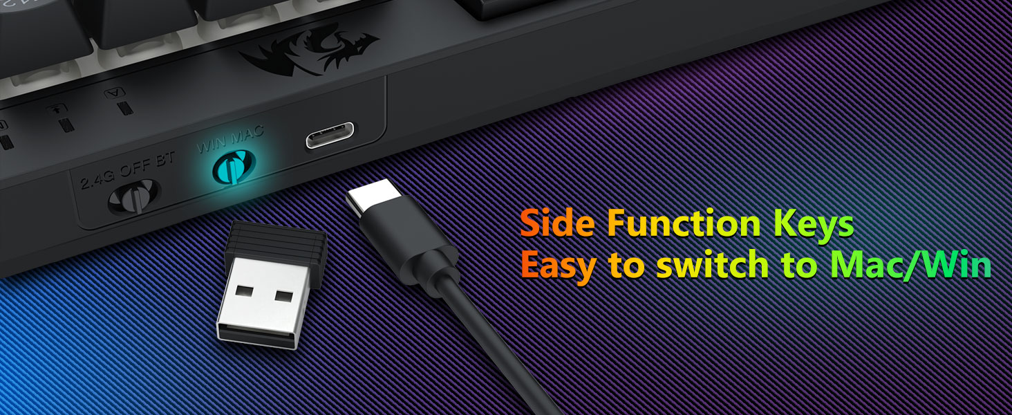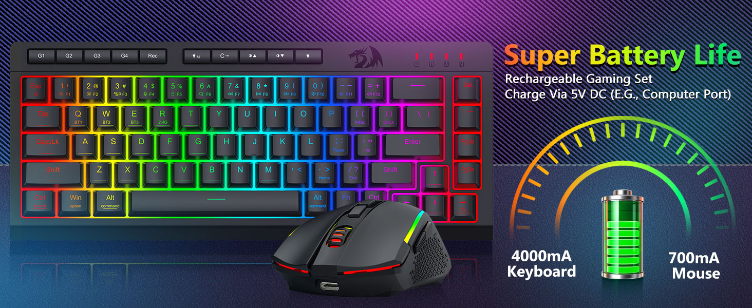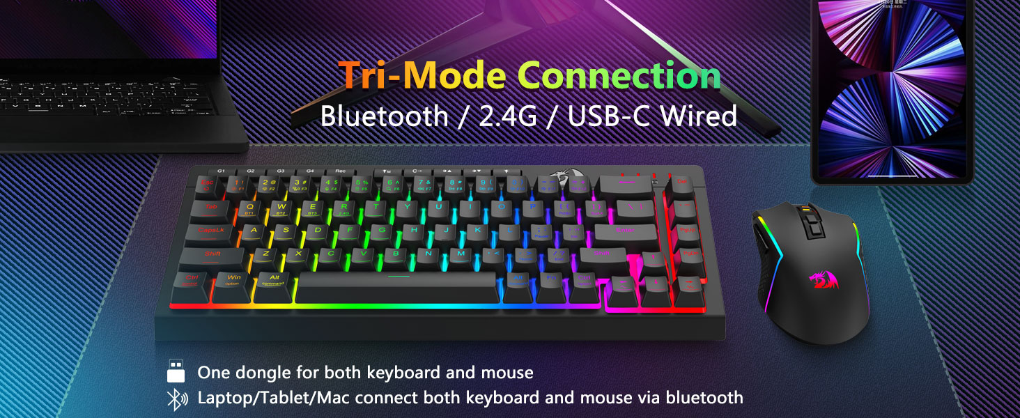 คีย์บอร์ดและเมาส์อเนกประสงค์แบบไตรโหมด- สลับระหว่างโหมดไร้สาย Bluetooth 5.0, 2.4GHz หรือแบบมีสาย USB-C ได้อย่างราบรื่น โดยเชื่อมต่อกับอุปกรณ์ต่างๆ (พีซี, Mac, แท็บเล็ต, โทรศัพท์, PS/XBOX) สลับอุปกรณ์ได้อย่างง่ายดายด้วยปุ่มลัดหรือปุ่มด้านข้าง เหมาะสำหรับการตั้งค่าการทำงาน/การเล่นเกมแบบผสมผสาน ใช้งานได้นานหลายสัปดาห์ด้วยคีย์บอร์ดแบตเตอรี่ 4,000mAh และเมาส์แบตเตอรี่ 700mAh (สแตนด์บาย 30+ วัน, รันไทม์ RGB 50 ชม.)