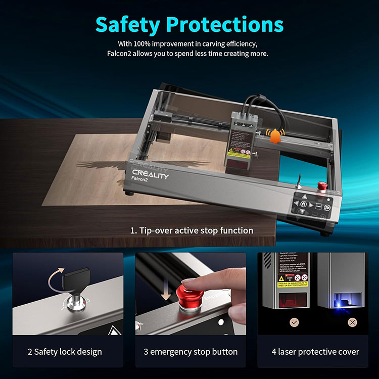 ·การป้องกันความปลอดภัยห้าประการ:สวิตช์ขีด จำกัด แบบสองทิศทาง หากหัวเลเซอร์กระทบกับขอบเขตมันจะหยุดโดยอัตโนมัติและเป็นกริ่ง ฟังก์ชั่นหยุดที่ใช้งานอยู่ การแกะสลักด้วยเลเซอร์จะหยุดทำงานในกรณีที่เอียงโดยไม่ตั้งใจพลิกหรือหล่นด้วยออดและตัวบ่งชี้การแจ้งเตือน การออกแบบล็อคความปลอดภัย มันสามารถใช้งานได้อย่างมืออาชีพเท่านั้น ปุ่มหยุดฉุกเฉิน ขั้นตอนเดียวที่จะหยุด ฝาครอบเลเซอร์ป้องกัน ทำจากวัสดุกระจกกรองสีซึ่งจะป้องกันไม่ให้เลเซอร์จากดวงตาที่พราว