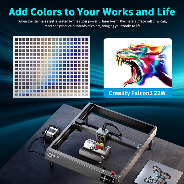 ·งานที่มีสีสันชีวิตที่มีสีสัน:เมื่อสแตนเลสถูกทำให้ร้อนด้วยลำแสงเลเซอร์ที่ทรงพลังอย่างยิ่งจากเครื่องแกะสลักเลเซอร์ Creality พื้นผิวโลหะจะตอบสนองทางร่างกายและผลิตหลายร้อยสีทำให้ผลงานของคุณมีชีวิตอยู่