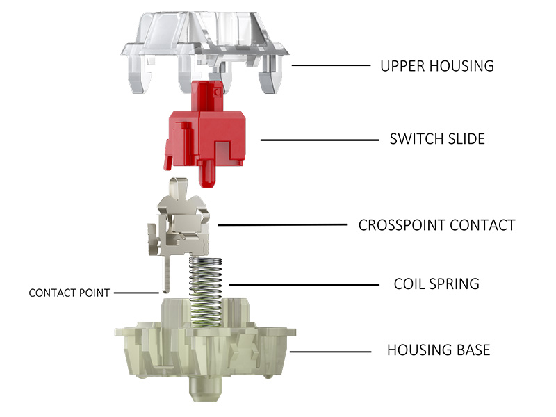 การออกแบบสวิตช์เชิงเส้นมีจุดมุ่งหมายเพื่อลดการรบกวนความต้านทาน ความแตกต่างของโครงสร้างระหว่างสวิตช์เชิงเส้นและสัมผัสที่ปรากฏในกลไกการกระตุ้นของพวกเขา: สวิตช์เชิงเส้นใช้รางนำทางลำต้นที่ราบรื่นและสปริงทรงกระบอกตรงโดยไม่มีการกระแทกหรือขั้นตอนที่ฐานต้นกำเนิด เมื่อกดลำต้นจะลงเชิงเส้นในขณะที่ความต้านทานสปริงเพิ่มขึ้นอย่างสม่ำเสมอ ในทางตรงกันข้ามสวิตช์สัมผัสจะสร้างการเปลี่ยนแปลงที่สัมผัสได้อย่างฉับพลันผ่านโครงสร้างเชิงกล-สวิตช์สีฟ้าใช้สปริงคอยล์และหน้าสัมผัสข้ามที่ปล่อยพลังงานจลน์ในช่วงกลางจังหวะทำให้เกิด "คลิก" สองขั้นตอนด้วยข้อเสนอแนะและเสียงที่สัมผัสได้เด่นชัด ความแตกต่างของโครงสร้างเหล่านี้จะกำหนดโปรไฟล์สัมผัสโดยตรง: สวิตช์เชิงเส้นให้ความราบรื่นด้วยเส้นโค้งความต้านทานในขณะที่สวิตช์สัมผัสโดยเจตนาสร้างข้อเสนอแนะการจัดฉากสำหรับจังหวะการพิมพ์แบบโต้ตอบมากขึ้น