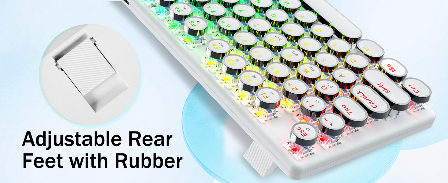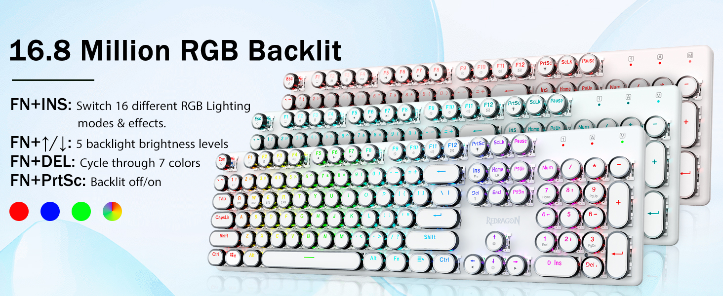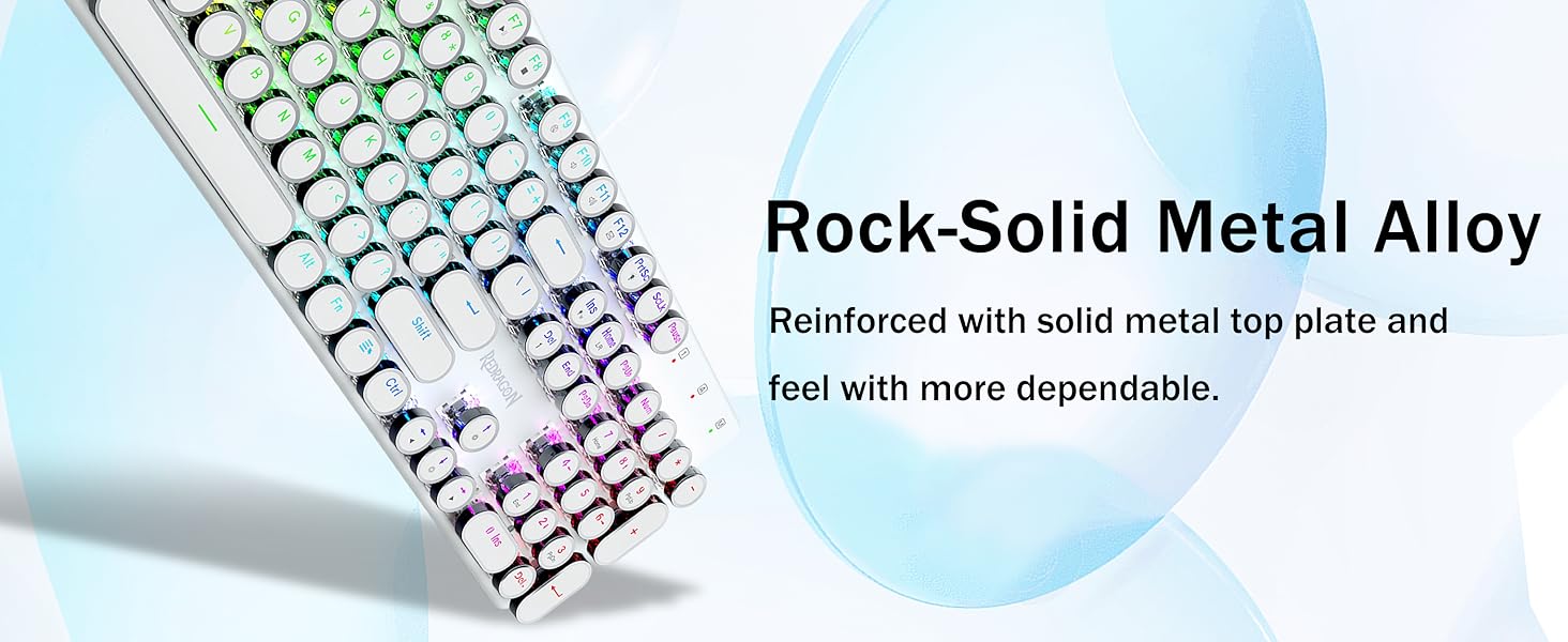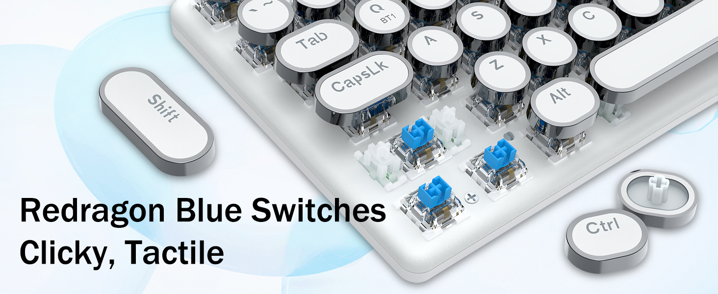 - สวิตช์สีน้ำเงิน Redragon Mechanical ให้ความต้านทานปานกลาง เสียงคลิกที่ได้ยินได้ และการตอบสนองด้านการสัมผัส ให้สภาพแวดล้อมและประสิทธิภาพการเล่นเกมที่ตอบสนองและแม่นยำ ปุ่มกดแบบกลมของคีย์บอร์ด Steampunk สไตล์วินเทจดูเหมือนเครื่องพิมพ์ดีดคลาสสิก ให้ความรู้สึกในการพิมพ์ที่สะดวกสบายและการคลิกสัมผัสที่เสถียร