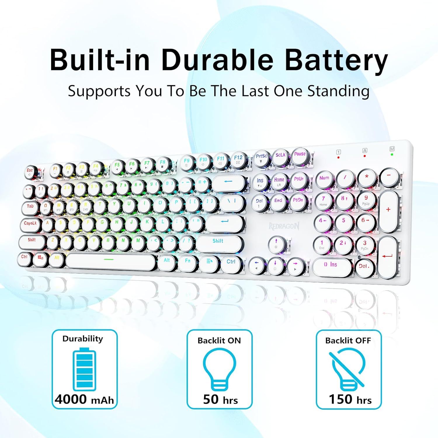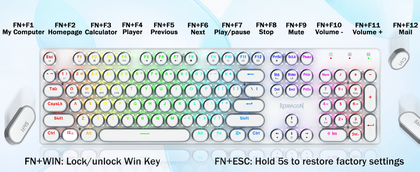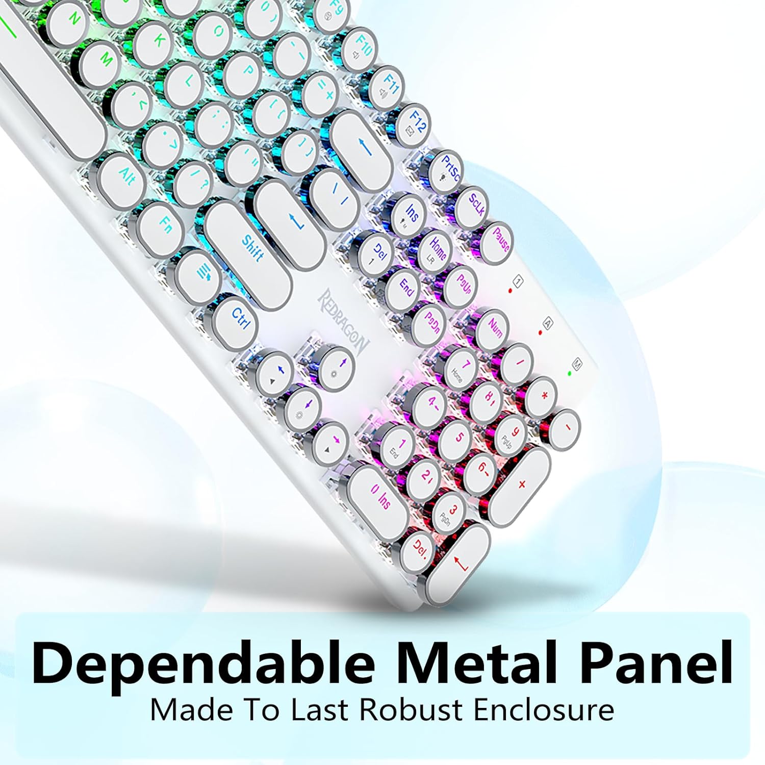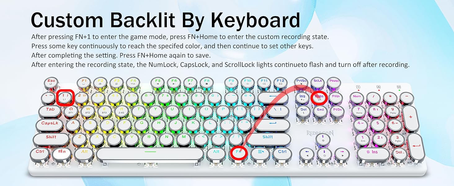- สวิตช์สีน้ำเงิน Redragon Mechanical ให้ความต้านทานปานกลาง เสียงคลิกที่ได้ยินได้ และการตอบสนองด้านการสัมผัส ให้สภาพแวดล้อมและประสิทธิภาพการเล่นเกมที่ตอบสนองและแม่นยำ ปุ่มกดแบบกลมของคีย์บอร์ด Steampunk สไตล์วินเทจดูเหมือนเครื่องพิมพ์ดีดคลาสสิก ให้ความรู้สึกในการพิมพ์ที่สะดวกสบายและการคลิกสัมผัสที่เสถียร