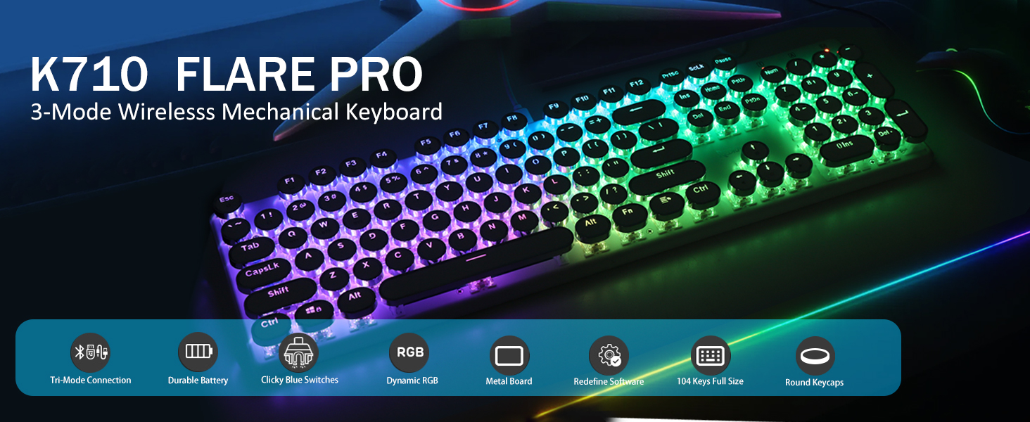 บัญชีผู้ใช้นี้เป็นส่วนตัว- เวอร์ชัน FLARE PRO ที่อัปเกรดแล้วยังคงใช้วัสดุโลหะแข็งถังแบบเดิม วางคีย์บอร์ดให้มั่นคงและสวยงามบนโต๊ะ เพื่อประสบการณ์การพิมพ์ระดับพรีเมียม แป้นพิมพ์ K710 รองรับเทคโนโลยีป้องกันการโกสต์ 104 คีย์ ช่วยให้สามารถกดหลายปุ่มพร้อมกันได้โดยไม่มีข้อขัดแย้ง