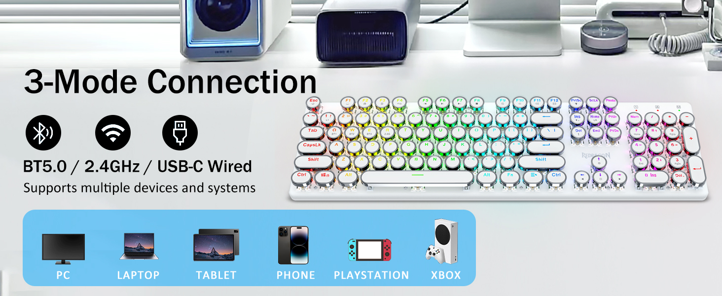 บัญชีผู้ใช้นี้เป็นส่วนตัว- มาพร้อมเทคโนโลยีการเชื่อมต่อสามโหมดที่เป็นนวัตกรรมใหม่ของ Redragon, โหมดไร้สายแบบมีสาย USB-C, บลูทูธ 3.0/5.0 และ 2.4Ghz ซึ่งจะทำให้ประสบการณ์การใช้งานของผู้ใช้ได้รับการอัพเกรดไปอีกระดับในทุกสาขา กด FN + Q/W/E ไปที่โหมด Bluetooth กด FN + R ถึงโหมด 2.4G